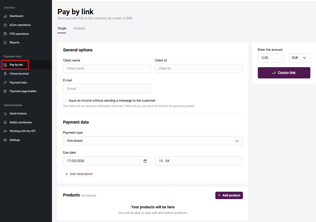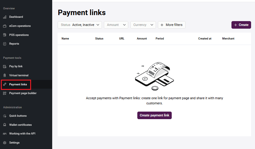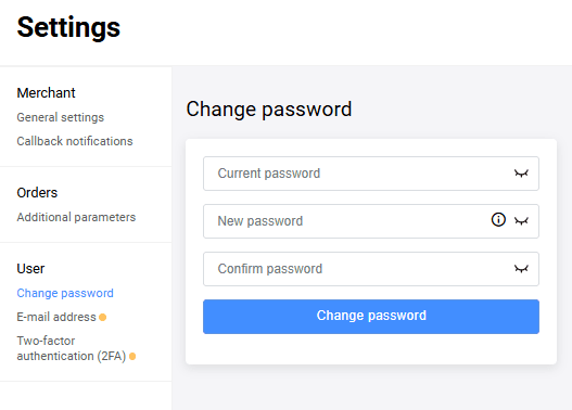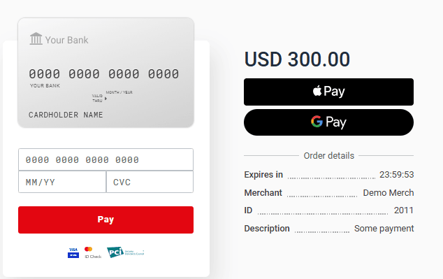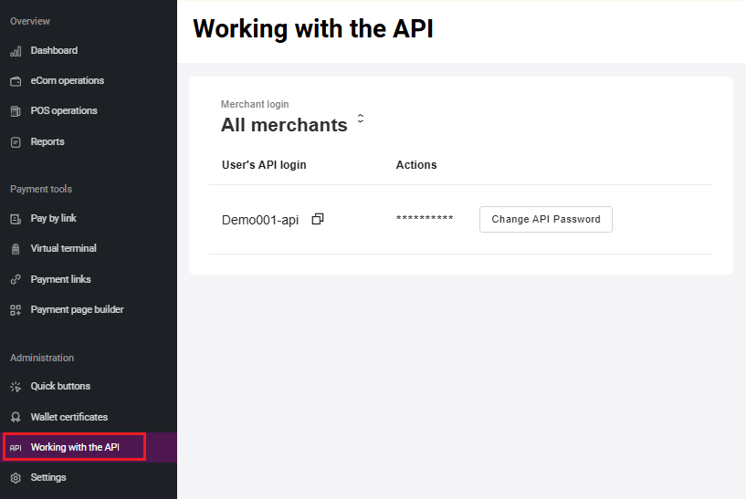 Merchants can create a payment flow as needed. For example, design own fully customized payment page. See more information about API by the link . When you create a Merchant, you receive an email with a login and a one-time password. After that you can generate API password by yourself on the Working with API page in Merchant Portal.