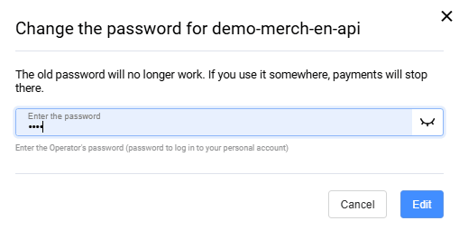 To change the API password, click Change API password and confirm the action in the newly opened window: