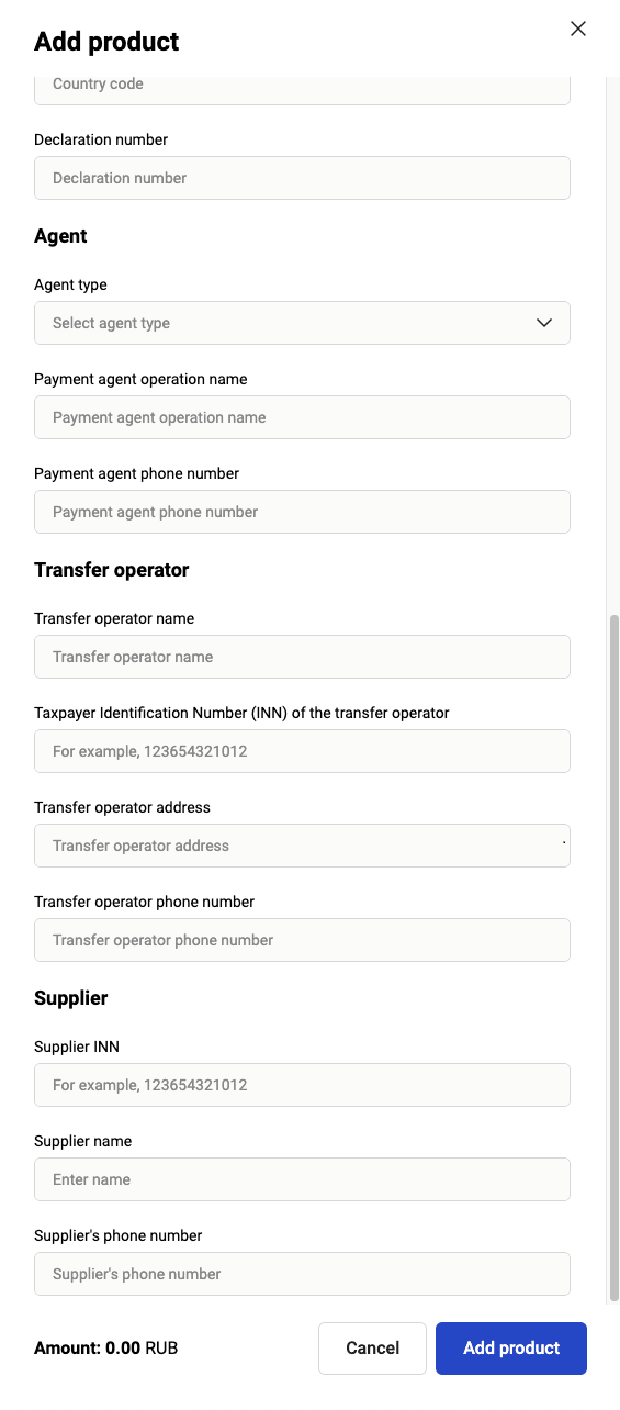 | Sale of goods under an agency agreement | It is used in case of selling goods under an agency agreement. If this option is selected, you must fill in the shopping cart when invoicing. Moreover, when adding an item to the cart, additional optional fields will be available for filling in. See the details here. |