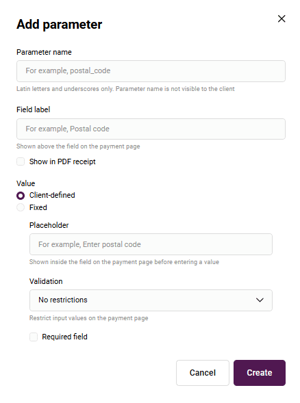 | Additional parameter | Additional user attribute that will be passed to the fiscal data operator. |