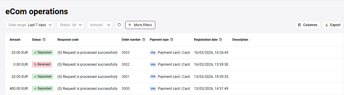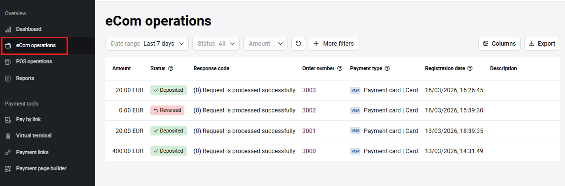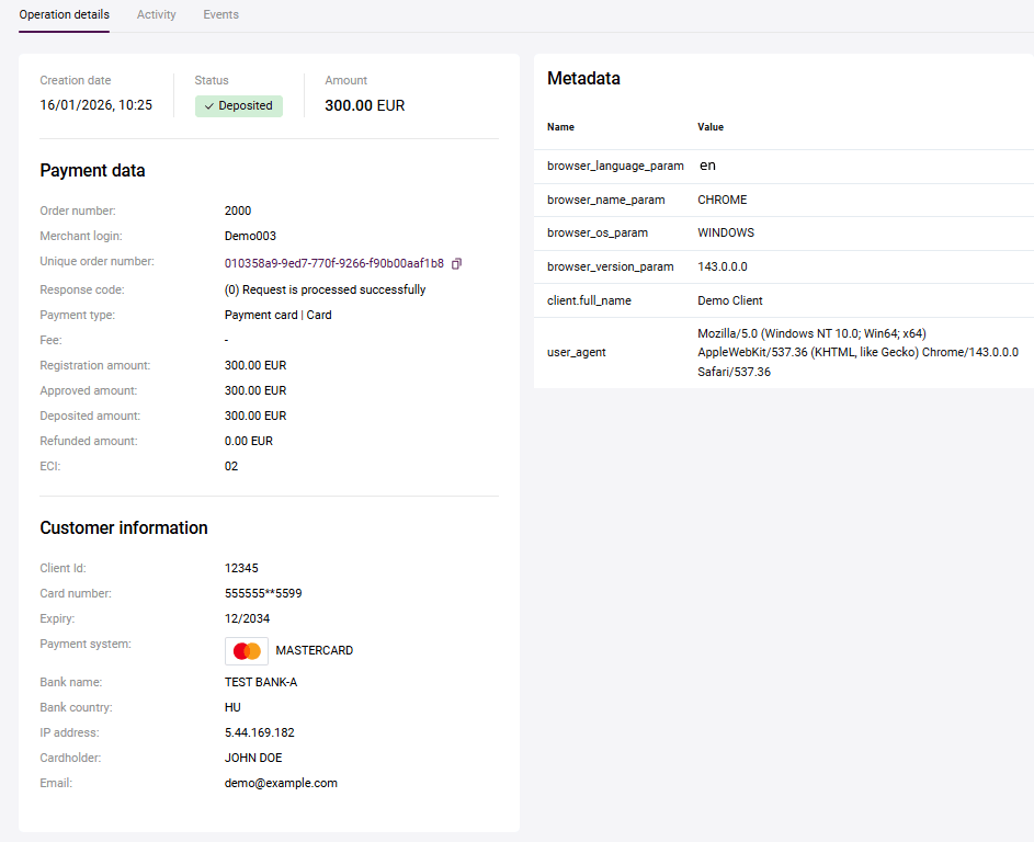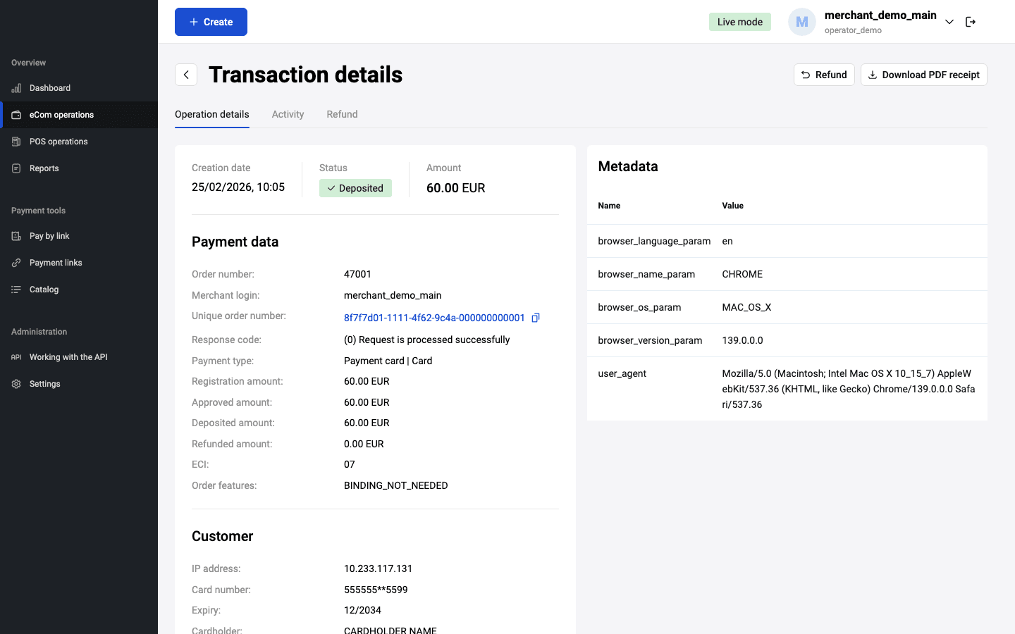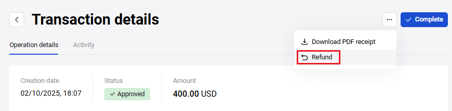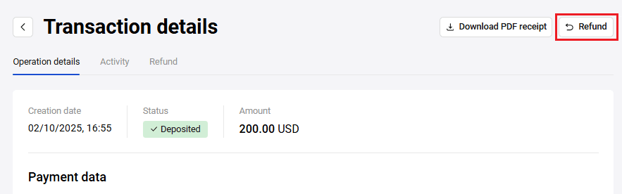 From your Personal Area you can issue full or partial refunds on orders paid by customers (when the order status is Deposited). For two-phase payments, the Deposited status means that the funds held on the payer's card have already been debited.