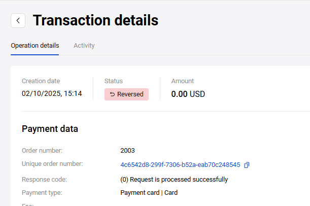 The Activity tab contains information about all events relevant to the order: payments, refunds, etc.
