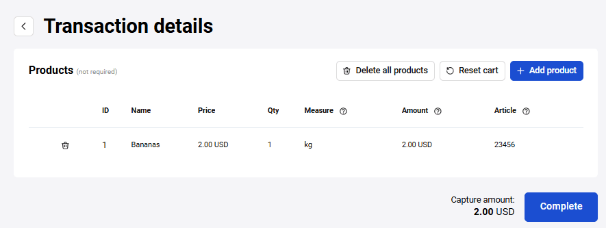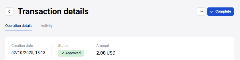 To complete a transaction, while on the Transaction details page, click on the Complete button.