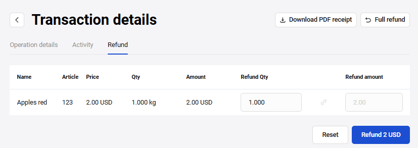 Column Description Name The name of the line item. Article Alphanumeric ID of a line item (vendor ID). Price Price of one product unit. Qty The quantity of the line item. Amount The total amount for specified line item (calculated automatically). Refund Qty The number of items to be returned. Refund amount The amount to be refunded. The field is calculated automatically. In Refund Qty field, indicate the number of items for which the refund should be issued. The resulting amount will be populated in the Refund amount field.