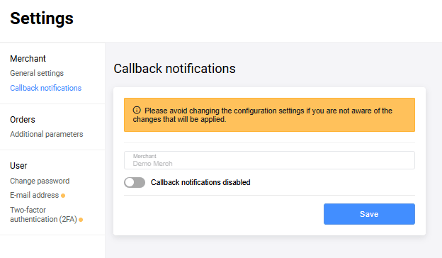 The Merchant Portal allows you to configure callback notifications. This section may be hidden for some Merchants. So if you don't see it or are not sure how to approach this, please contact the Support Service and we will be glad to help.