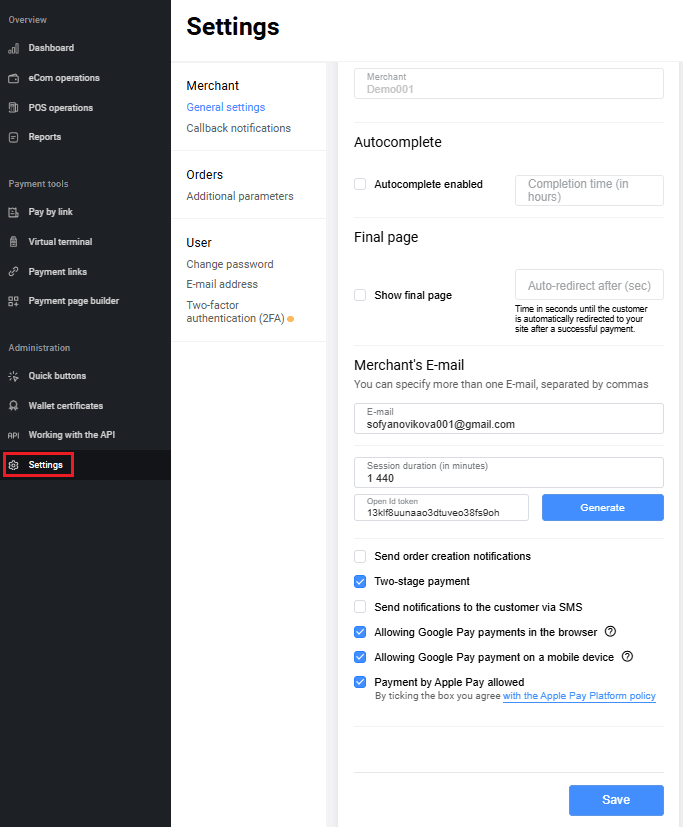 To go to the General Settings section, select Settings on the side menu, and then select General Settings in the Merchant block. The account settings page will be displayed as shown below.