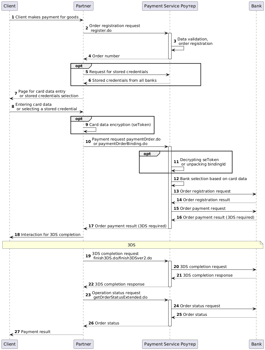 13-16. The Роутер Payment Service sends requests to the bank for order registration and payment. The bank returns the results of registration and payment (in the diagram — 3DS required).