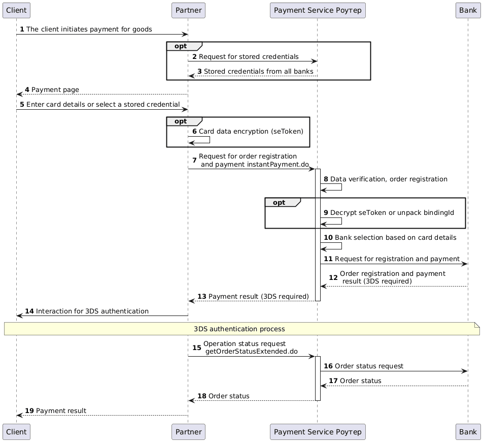 For the payment, it is possible to send card data, an encrypted token, or stored credential ID to the Роутер Payment Service.