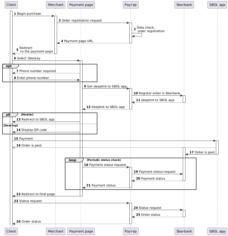 18-22. The payment page periodically requests the payment status from the payment service while the Client makes a payment through Sberbank Online on their device. When the payment status changes, the payment page redirects the Client to the final page. Depending on the payment result, this is either the failUrl or the returnUrl.
