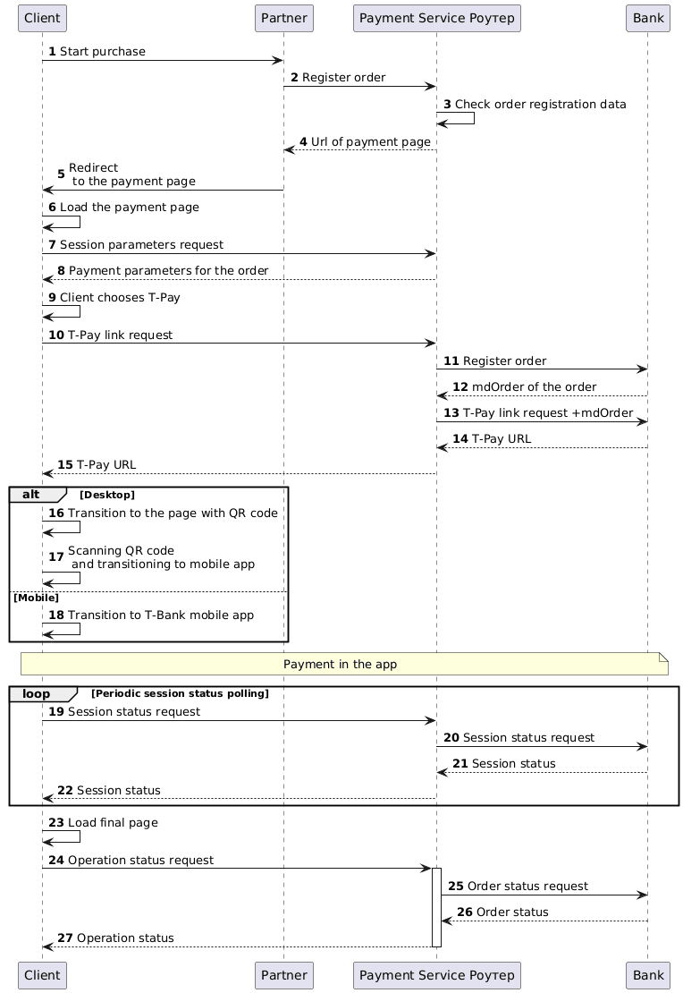 15. The Payment Service Роутер sends the T-Pay link to the payment page. Further steps vary slightly depending on the Client’s device.