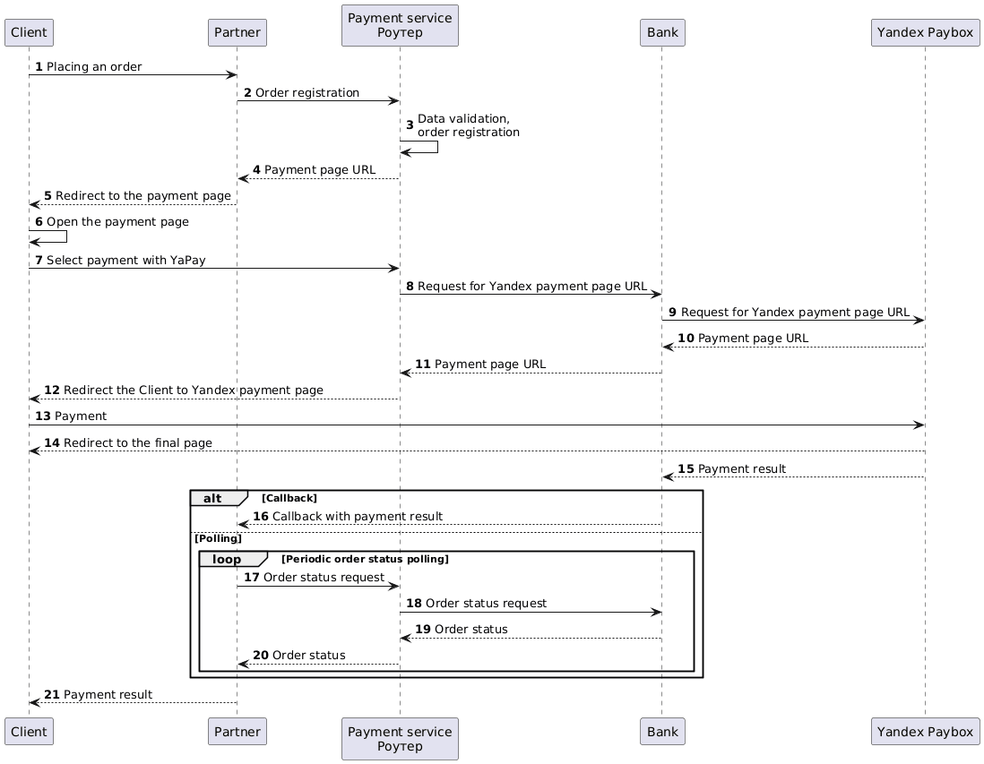 Payment service Роутер enables Yandex Paybox payments via API. With the Yandex Paybox payment way, an order can be paid with Yandex Pay or Yandex Split. Payment is made on the Yandex payment page; the URL of that page is provided by the Yandex Paybox service.