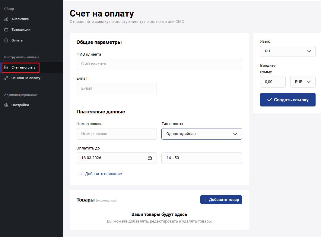 Раздел Каталог товаров позволяет быстро выбирать товары при создании счета на оплату. Чтобы попасть в раздел Каталог товаров, нажмите