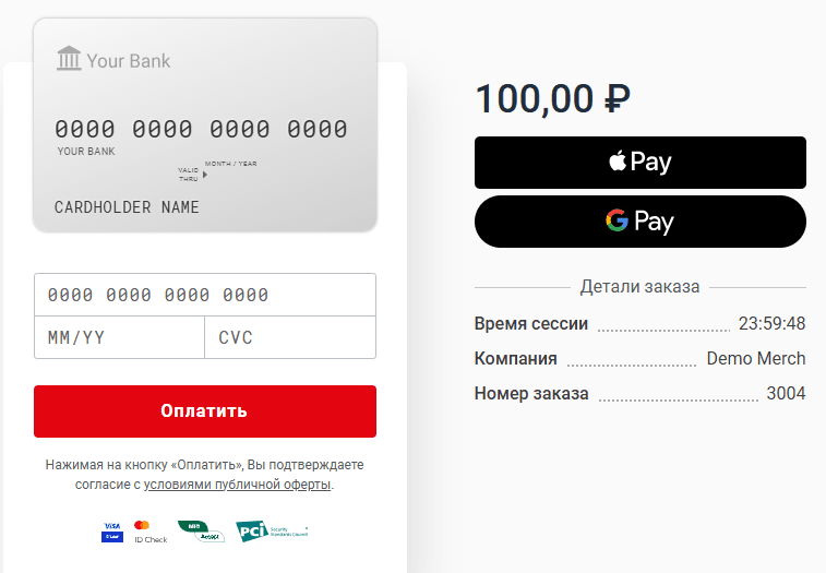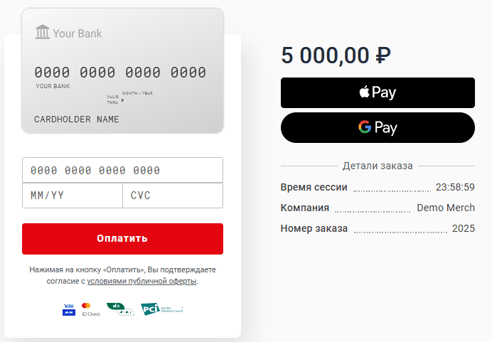 | Продолжительность сессии (в минутах) | Срок, отведенный для ввода данных карты с момента регистрации платежа. Если оплата не будет произведена в указанный срок, заказ перейдет в статус ОТКЛОНЕН. После этого будет отправлен callback, если он настроен. Изменение статуса таких заказов осуществляется по расписанию, поэтому возможны небольшие задержки. Если вы запросите статус по такому заказу, и по нему истекло время, заказ будет немедленно переведен в статус ОТКЛОНЕН. |