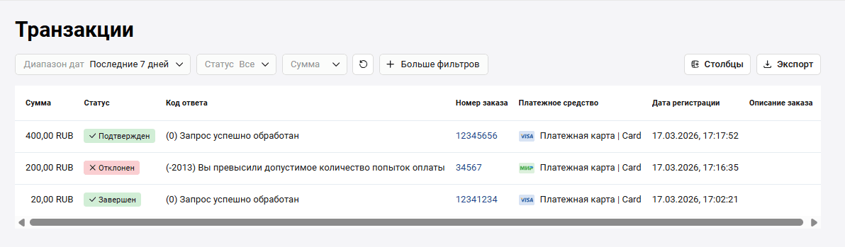 На вкладке Активность содержится информация обо всех событиях по заказу: зачислениях оплаты, возвратах и т.д.
