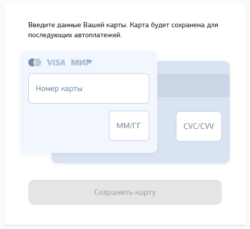 - На специальной странице для сохранения карты. Для использования этого способа требуются специальные настройки Партнера. Обратитесь в службу поддержки.