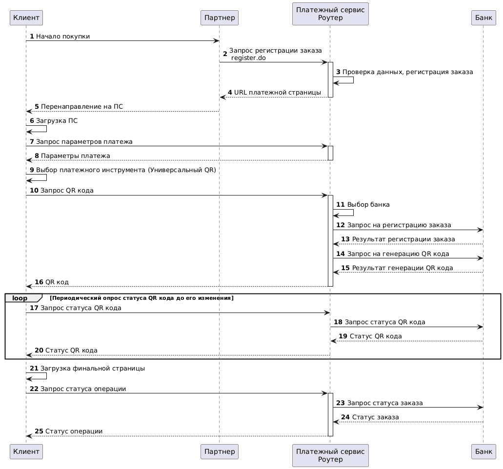 20. Платежный сервис Роутер отправляет статус QR кода на платежную страницу Клиента. Если статус не изменен, возвращение на шаг 18. Если изменен — переход на шаг 21.