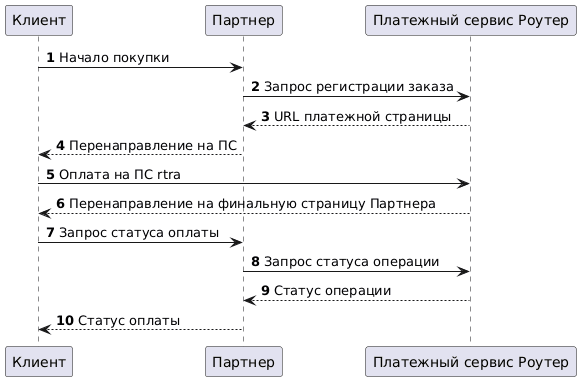 При простой интеграции Партнер использует платежную страницу (ПС) Платежного сервиса для проведения оплаты. После отправки API-запроса на регистрацию заказа Партнер перенаправляет Клиента на платежную страницу, а затем узнает статус оплаты заказа от Платежного сервиса.