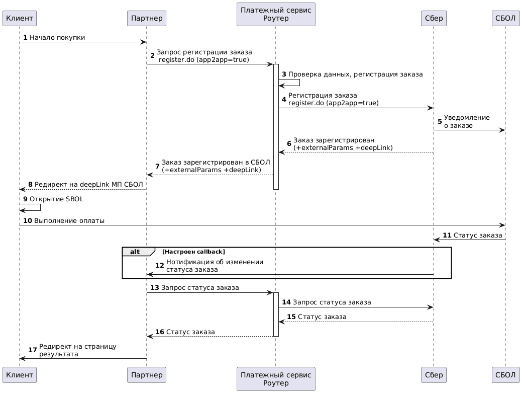 Этот сценарий используется при оплате в мобильном приложении Партнера. Для оплаты будет открыто мобильное приложение Сбербанк Онлайн (СБОЛ), а после подтверждения оплаты Клиент вернется в приложение Партнера.