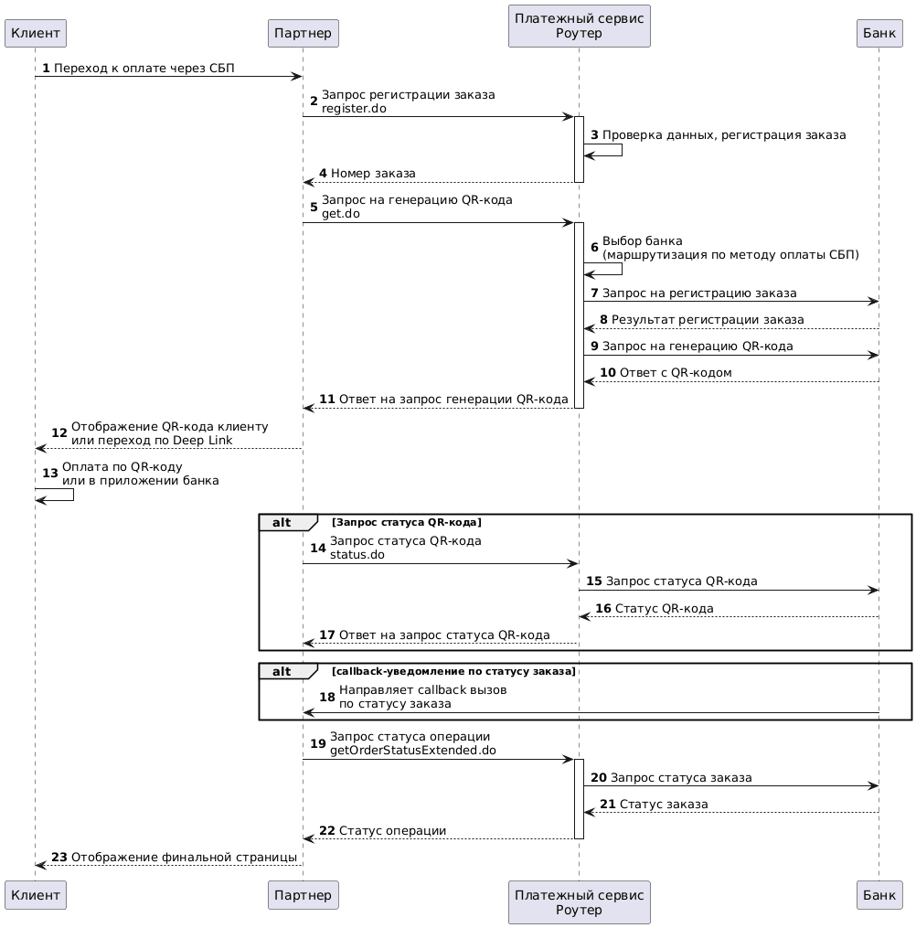 2. Партнер направляет в Платежный сервис Роутер запрос регистрации заказа: register.do для одностадийной оплаты или registerPreAuth.do для двухстадийной оплаты. Особенности двухстадийной оплаты с помощью СБП описаны в разделе Двухстадийная оплата и СБП.