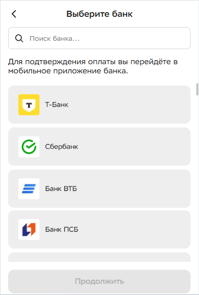 - На мобильном устройстве Клиента должно быть установлено приложение выбранного банка. Переход на следующий шаг не произойдет, пока не будет выбран банк с установленным приложением.