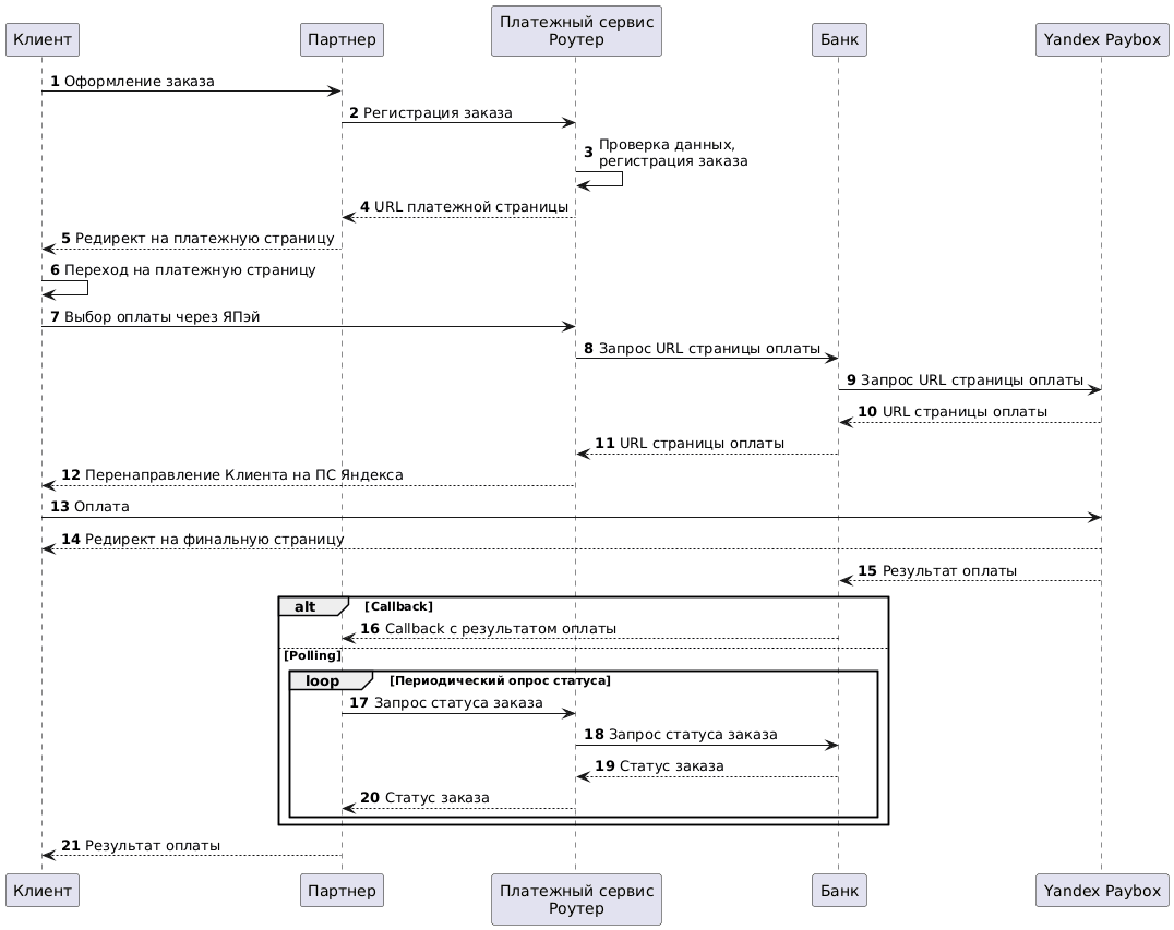 Банк запрашивает URL страницы оплаты в сервисе Yandex Paybox. При этом передается также URL для возврата, на который сервис Yandex Paybox должен будет перенаправить Клиента после завершения оплаты.